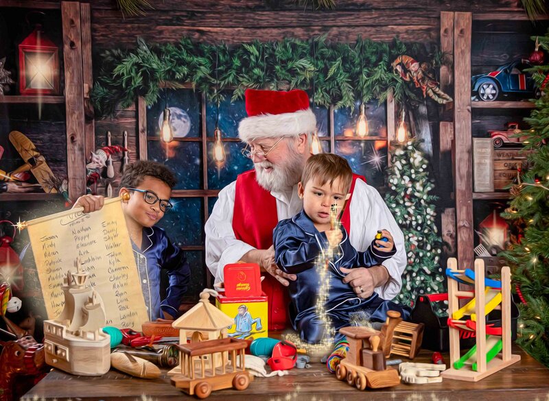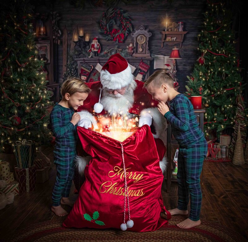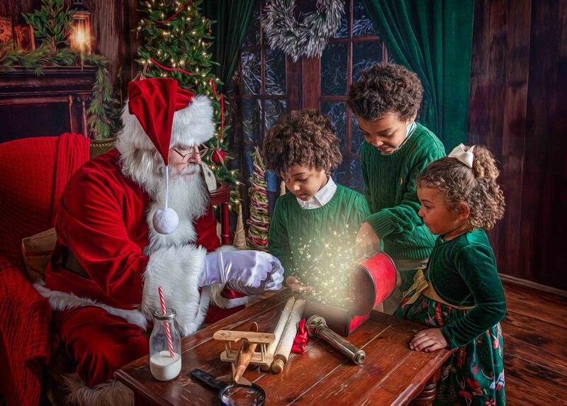 At your private reveal appointment, you’ll select from curated collections or build your own custom package. Options include wall art, heirloom albums, holiday cards, custom storybooks tailored to your child’s time with Santa, and digital files.